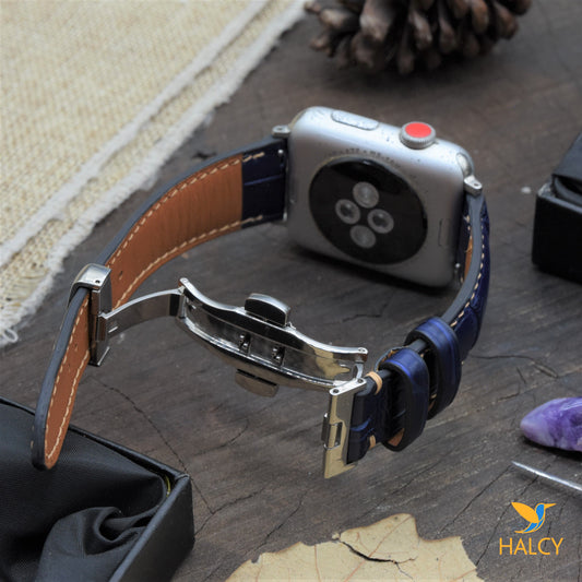 Custom Handmade Alligator Leather Watch Band Fit for Apple watch Series 8, 7, 6, 5, 4, 3 : Choice of adapters and Steel Butterfly Clasp color