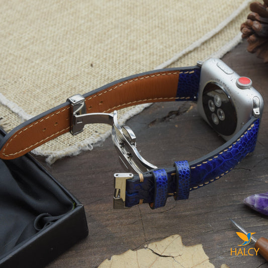 Custom Handmade Ostrich Leg Leather Watch Band Fit for Apple watch Series 8, 7, 6, 5, 4, 3 : Choice of adapters and Steel Butterfly Clasp color